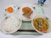 ●今日の給食●・ごはん・赤魚の柚子みそ焼き・にんじんシリシリ・根菜汁・果物(みか...