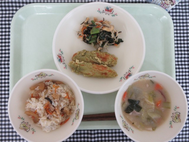今日は八王子の郷土料理である「かてめし」と桑の葉粉を衣に入れた桑都揚げです。