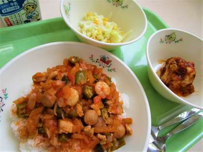 「ガンボ」は、肉類と野菜がたっぷり入った煮込み料理です。とろみづけにオクラを使うのが特徴です。ごはんにかけるのが伝統的な食べ方です。今日はアメリカ合衆国の味を楽しみました。