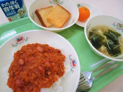 チリコンカンは、豆と肉をチリパウダーでスパイシーに煮込んだアメリカ生まれのメキシコ料理です。豆は、大豆やひよこ豆、金時豆などが使われますが、給食では、金時豆を入れました。