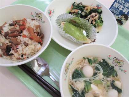 日本遺産献立から今日は「桑都御膳」です。八王子は、養蚕と織物が盛んだったことから「桑都」と称され“織物の町”として栄えました。かてめしは、お米が貴重だった時代、野菜などを混ぜて量を増やしたご飯です。桑都焼きは「八王子八景」の中から「桑都の晴嵐」をイメージした料理で、桑の葉パウダーとマヨネーズを混ぜたソースを笹かまぼこにかけて焼きました。絹のすまし汁は、うずらの卵を繭玉にそうめんを絹糸に見立てたお吸いものです。八王子の歴史に思いを寄せていただきましょう。