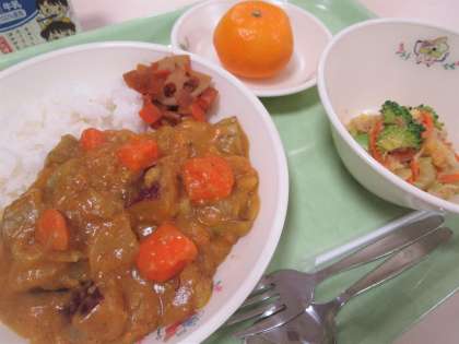 根菜には、根を食べる野菜と地下にできる茎を食べる野菜があります。根を食べる野菜には、大根・にんじん・ごぼう・かぶ・さつま芋・山芋などがあり、茎を食べる野菜には、じゃが芋・里芋・れんこん・しょうが等があります。今日のカレーには、さつま芋とごぼうとしょうがを入れました。血行を良くして身体を温めてくれる野菜です。