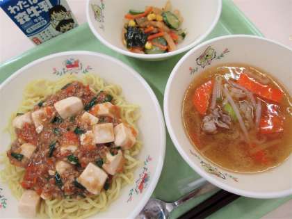 マーボー豆腐は、豆板醤や唐辛子で辛さを調節しますが、給食では、豆板醤の量を控えて辛さを抑えています。ご飯にかけて食べることが多い料理ですが、今日は、焼きそばの麺にかけて食べます。マーボー豆腐は、麺との相性も抜群です。ご家庭でもお試しください。