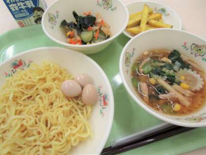 はちっこつけ麺は、八王子市のご当地ラーメンである「八王子ラーメン」をつけ麺風にして、トッピングの刻み玉ねぎをスープに入れた給食センターオリジナルのラーメンです。給食では、器が小さいので麺とスープは別だしにして、つけ麺で食べる形にアレンジしました。また栄養を考えて野菜たっぷりスープになっています。