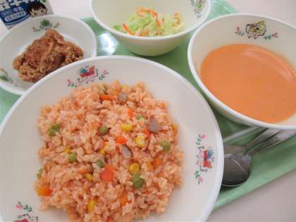 給食では、東京2020オリンピック・パラリンピックに向けて、オリンピック夏季大会開催国の料理や食文化を紹介します。今日はアメリカ合衆国で行われた第23回にちなみ、アメリカで親しまれている献立を作りました。