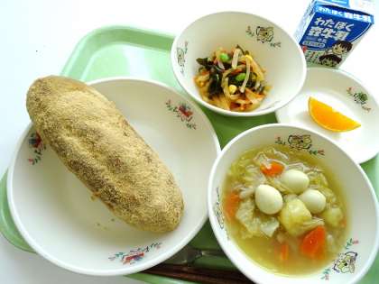 9月8日桑の日にちなみ、八王子産桑の葉粉を練りこんだ桑の葉パンで、揚げパンを作りました!