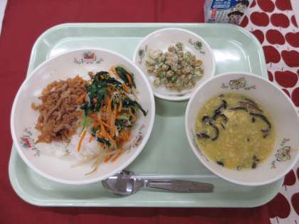 ビビンバの具は、食缶の中を4等分にすると盛り付けやすいです。