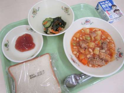 今日のポークビーンズは、豚肩肉をやわらかく仕上げるために朝早くから調理員さんがじっくり煮込んでいます。野菜や大豆もたっぷり入っているので、しっかり食べて暑い日も元気に過ごせるようにしましょう!