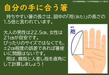 大人の男性は22.5cm、女性は22cmが目安です。ぴったりのサイズではなくても、±2cm程度の誤差であれば箸使いに問題はないです。咫(あた)は、親指と人差し指を直角にして計算しましょう!(画像2枚目)