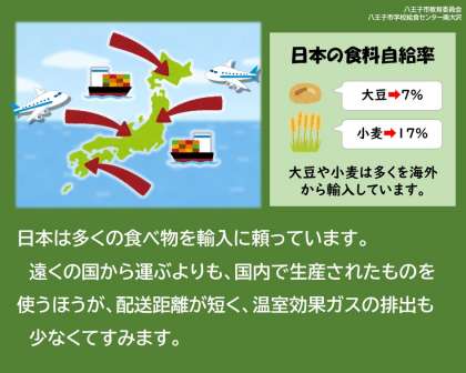 日本は、多くの食べ物を輸入に頼っています。移動距離が長い分、排気ガスも多くなります。食品を選ぶ際は、国産を意識してみましょう🌎