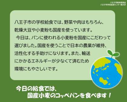 八王子市の給食は、野菜や肉、大豆、小麦粉も国産を使用しています。
