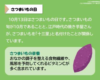 10月13日はさつまいもの日です。さつまいもの旬が10月であることと、江戸時代の焼き芋屋さんが、さつまいもを「十三里」と名付けたことが関係しています。