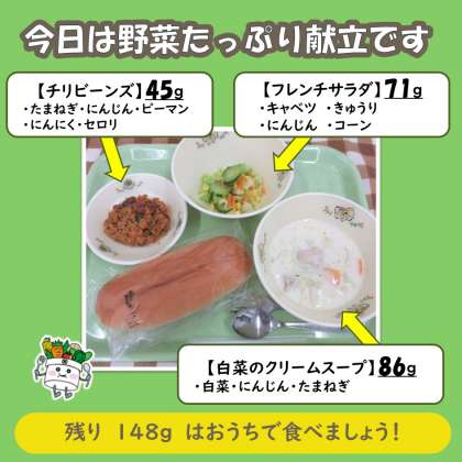 給食を1人分食べると、およそ200gの野菜をとることができます!残りの150gはお家で食べるようにしましょう!毎日意識して野菜をとれるとよいですね😊