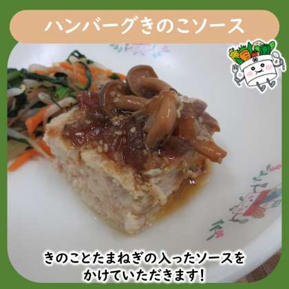 ハンバーグのソースはしょうゆベースの味付けで、えのき・しめじ・たまねぎ・しょうがなどが入っています。しょうがの香りとたまねぎの甘みを感じるおいしいソースでした✨