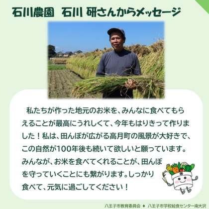給食センターでは高月清流米を提供しました!食育メモには、八王子産米の紹介と米農家の石川さんからいただいたメッセージを配布しました。
