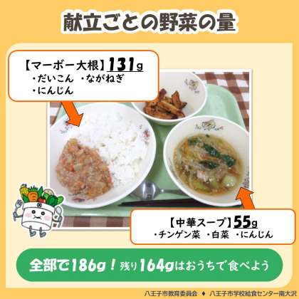 今日の給食を一人分食べると『186g』の野菜をとることができます!