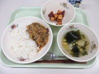 ●今日の給食●・ごはん・たくあん入り豚キムチ・大学芋・わかめスープ・牛乳http...