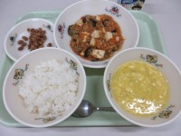 ●今日の給食●・ごはん・マーボーなす・豆黒糖・コーンと卵のスープ・牛乳https...