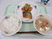 ●今日の給食●・ごはん・さばのごま風味焼き・有機かぼちゃのそぼろ煮・みそけんちん...