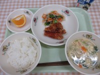●今日の給食●・ガーリックライス・チキンのトマト煮込み・フレンチサラダ・はち米っ...