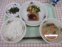 ●今日の給食●・ごはん・蓮根とひじきハンバーグ・和風サラダ・オニオンスープ・果物...