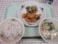 ●今日の給食●・ごはん・ヤンニョムチキン・3色ナムル・きのこと卵のスープ・果物(...