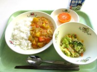 ●今日の給食●【旬:ブロッコリー】・カレーライス・ビーンズサラダ・果物(菊花...