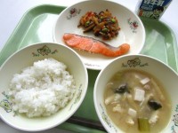 ●今日の給食●・ごはん・鮭の塩焼き・東京うどの炒め煮・チンゲン菜と豆腐のみそ...