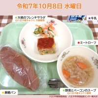 《今日の献立》ごはん鮭の塩焼き野菜の彩り和え😊豚汁😊牛乳(😊...八王子産食材を...