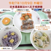 《今日の献立》ごはん鮭の塩焼き野菜の彩り和え😊豚汁😊牛乳(😊...八王子産食材を...