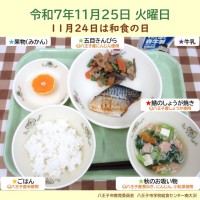 《今日の献立》ごはんよごし😊ホッケの塩焼き呉汁😊牛乳(😊...八王子産食材を...