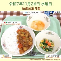 《今日の献立》ポークカレーライス😊ビーンズサラダ😊アップルポンチ牛乳(😊...八...