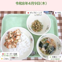 《今日の献立》ごはんマーボー豆腐😊ポップビーンズ中華スープ😊牛乳(😊...八王子...