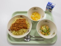 ●今日の給食●・スパゲティミートソース・えだまめサラダ・フルーツポンチ・牛乳...