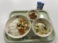 ●今日の給食●・ごはん・四川豆腐・大豆の揚げ煮・わかめと卵のスープ・牛乳◆献...