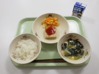 ●今日の給食●・ごはん・四川豆腐・大豆の揚げ煮・わかめと卵のスープ・牛乳◆献...