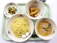 ●今日の給食●・はち大根おろしスパゲティ・野菜とジャコのサラダ・フルーツポン...