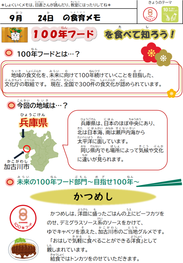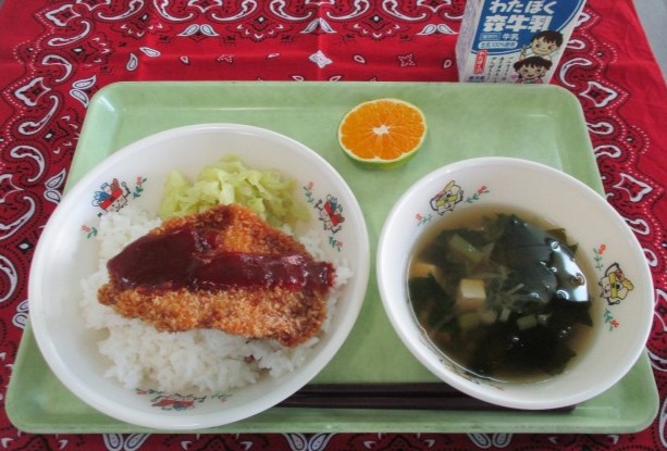 9月24日(水)の給食 公開日 2025/09/25 更新日 2025/09/24 給食室 【メニュー】・かつめし・青菜と豆腐のすまし汁・果物(みかん)・牛乳【八王子産の食材】キャベツ、小松菜、長ねぎ いいね(0)