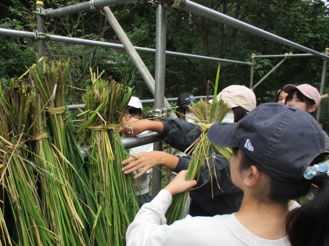 刈った後のわらで束ねる作業は、思った以上に難しく、力加減や隙間なく結ぶ作業に苦労する姿も見られました。それでも、友だちと協力しながら、最後にはしっかりと束ねることができました。