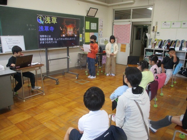 また、4年生は社会科見学で訪れた浅草寺と東京スカイツリーについて、見たり聞いたりして学んだことをスライドにまとめて発表しました。浅草寺では歴史ある建物を見学し、東京スカイツリーでは展望台からの景色を眺めながら、八王子とは違う東京の姿を学ぶことができました。