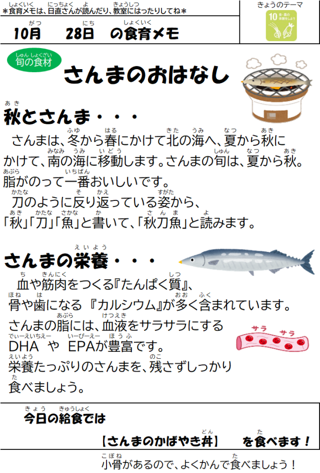 10月28日(火)の給食 公開日 2025/10/29 更新日 2025/10/28 給食室 【メニュー】・さんまのかばやき丼・さつまいものみそ汁・梅しらす和え・牛乳【八王子産の食材】さつまいも、小松菜、キャベツ いいね(0)