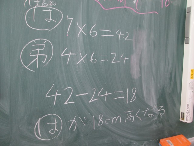 たし算・ひき算とかけ算の混じった式や計算を考えました。問題を確認すると、「全部たし算でやってみてもいいが、それだと1年生だし、かけ算を今まで学習していたからなぁ。」「一人一人の代金で考えてみます。」「ジュースはジュース、みかんはみかんで考えます。」などを話し、様々な式で問題を解きました。友だちの発表を聴くと、「僕もこの方法で問題を解きました。」「あっ、この考えもあったんだ。」「今回の問題は、身近な生活の場面なので、やってみようと思いました。」など発言し、学習したことを生活の場面に活用しようという意欲がみられました。