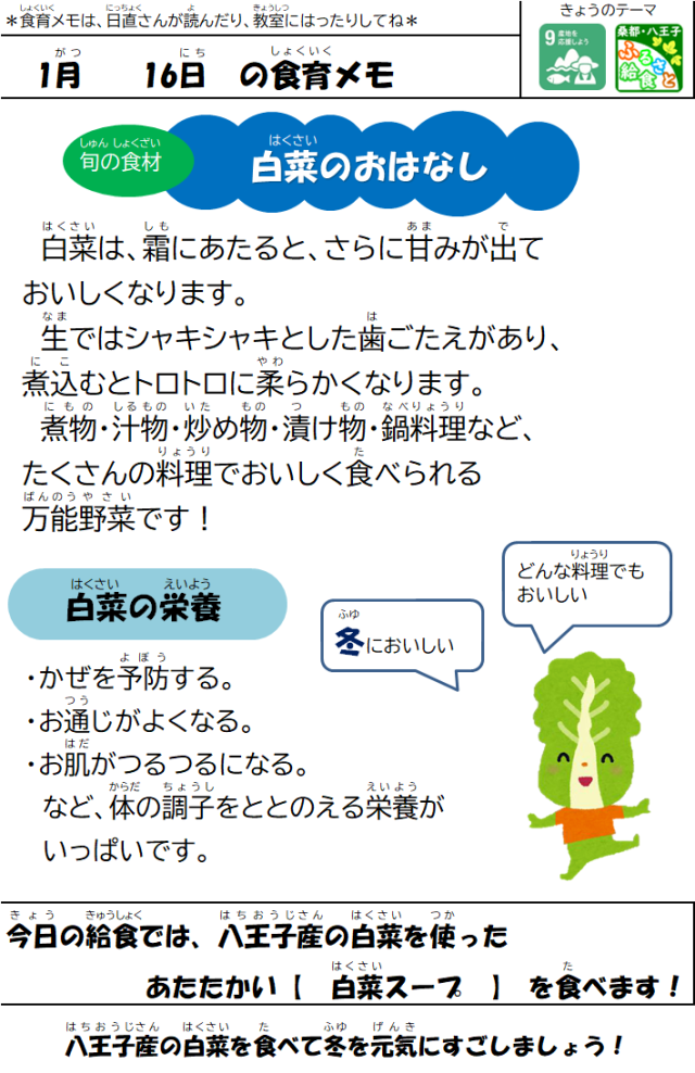 1月16日(金)の給食 公開日 2026/01/17 更新日 2026/01/16 給食室 【メニュー】・スパイシーカレーピラフ・うずらたまごのカレー煮・八王子産白菜のスープ・ポテトカルボナーラ・牛乳【八王子産の食材】有機にんじん、白菜 いいね(0)
