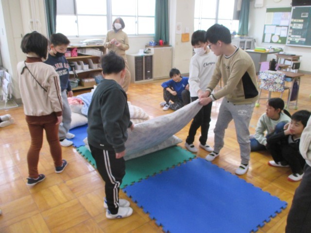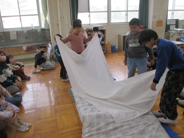 のびのび学級の宿泊学習に備えて、布団を敷く学習をしました。上級生と下級生がペアになって、一緒に布団を敷く練習をしました。楽しそうに布団敷きに取り組むことができました。