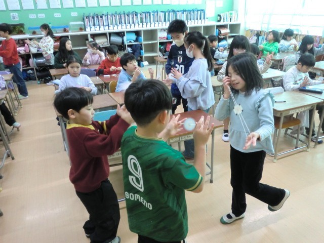 生活科の授業で取り組んでいる「びゅんびゅんごま」。紙は1枚がいいのか2枚がいいのか? ひもの長さはどれぐらいがいいのか? 穴の大きさは? 試行錯誤しながら作ってきたびゅんびゅんごまです。かた結びができずに苦戦している子に教えてあげたり、回り方のこつをアドバイスしてあげたり、友達どうしで上手に関わることで、みんなで上達してきました。次は1年生に教えてあげる予定です。