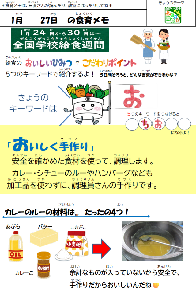 1月27日(火)の給食 公開日 2026/01/28 更新日 2026/01/27 給食室 【メニュー】・カレーライス・野菜のピクルス・ヨーグルトのピーチソースかけ・牛乳【八王子産の食材】にんじん、大根 いいね(0)