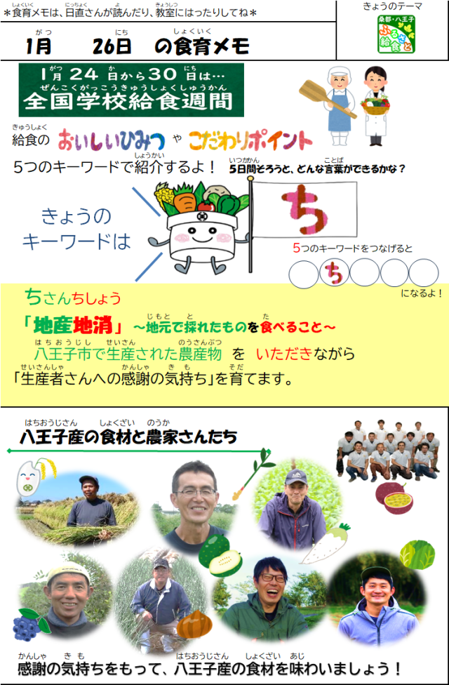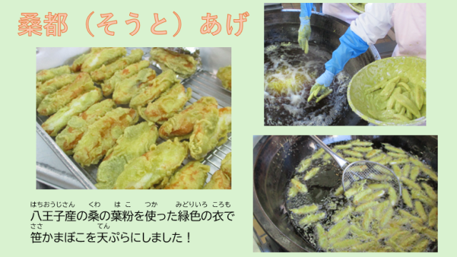 1月26日(月)の給食 公開日 2026/01/27 更新日 2026/01/27 給食室 【メニュー】・わかめごはん・桑都(そうと)揚げ・はっちくんのみそ汁・ごま和え・牛乳【八王子産の食材】たまご、さつまいも、白菜、にんじん、大根、しいたけ、小松菜 いいね(0)