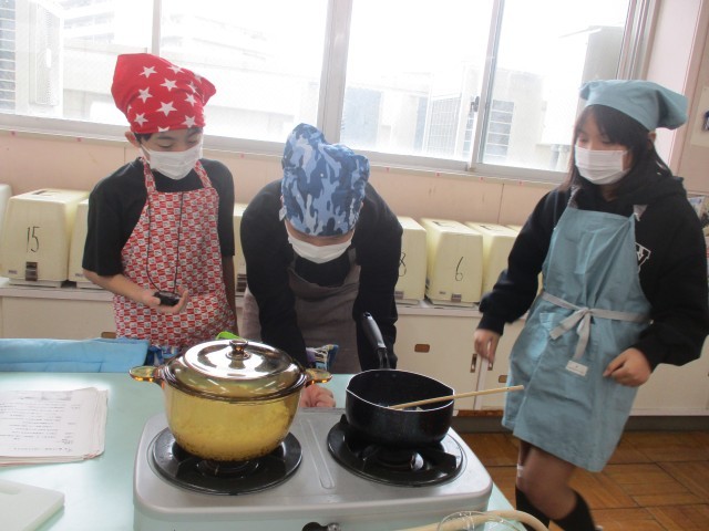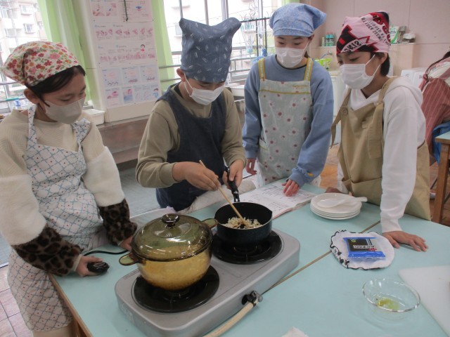 5年生では、今日から家庭科の授業でご飯を炊く調理実習「おにぎり会」が始まりました。