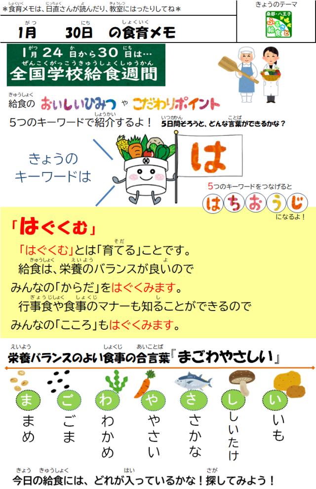 1月30日(金)の給食 公開日 2026/02/03 更新日 2026/02/03 給食室 【メニュー】・ごはん・夕焼小焼やき・のりの佃煮・呉汁・野菜の彩り和え・牛乳【八王子産の食材】にんじん、大根、長ねぎ、小松菜、さつまいも※さつまいもは、秋葉台小の畑で育ったさつまいもです。 いいね(0)