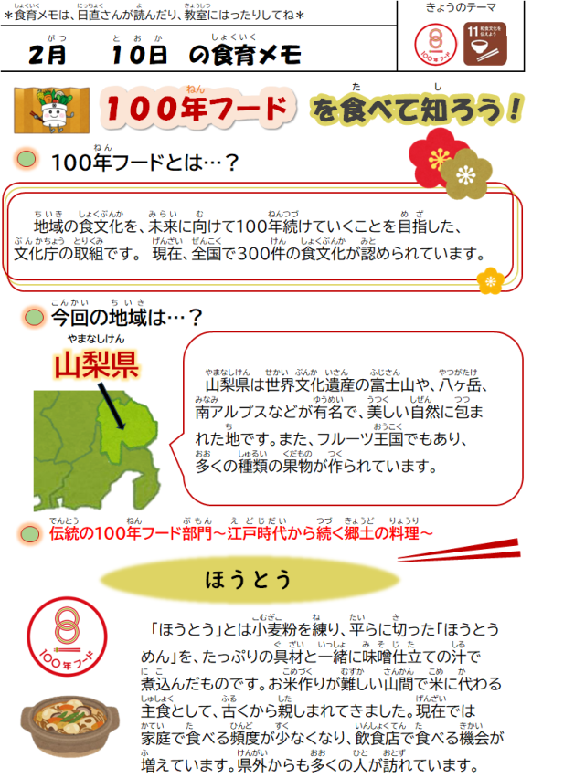 2月10日(火)の給食 公開日 2026/02/12 更新日 2026/02/10 給食室 【メニュー】・ほうとううどん・ポテトたこ揚げ・野菜の香り和え・果物(せとか)・牛乳【八王子産の食材】にんじん、大根、長ねぎ、白菜、キャベツ、たまご いいね(0)